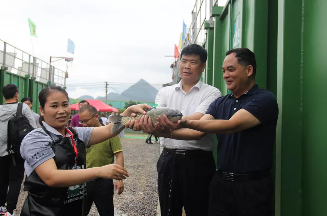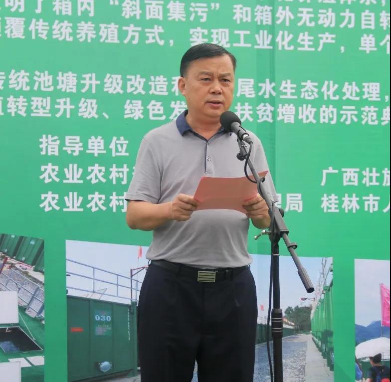 李首群在致辭中說,近年來,桂林市圍繞“提質增效、減量增收、綠色發展、富裕漁民”目標,加快推進水產養殖業綠色高質量發展。自主創立打造的“田里種稻、坑中養魚、基面經作、蓬上瓜果”高標準稻漁綜合種養桂林模式,2017年獲得首屆全國稻漁綜合種養模式創新大賽金獎,2018年成功創建全國稻漁綜合種養示范區,成功引進冷水魚和大閘蟹養殖,積極探索“集裝箱養魚”“池塘內循環水槽養殖”“種藕養魚”“種菜養魚”、山區小窩流水養魚等新型“凈水漁業”養殖模式和休閑漁業,取得了較好效果。全國“集裝箱+生態池塘”尾水處理技術模式觀摩活動”在桂林舉辦,是桂林市農業的一件大喜事,也是促進桂林進一步提升水產養殖業綠色高質量發展的一個重要契機。